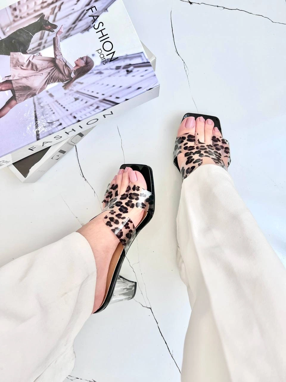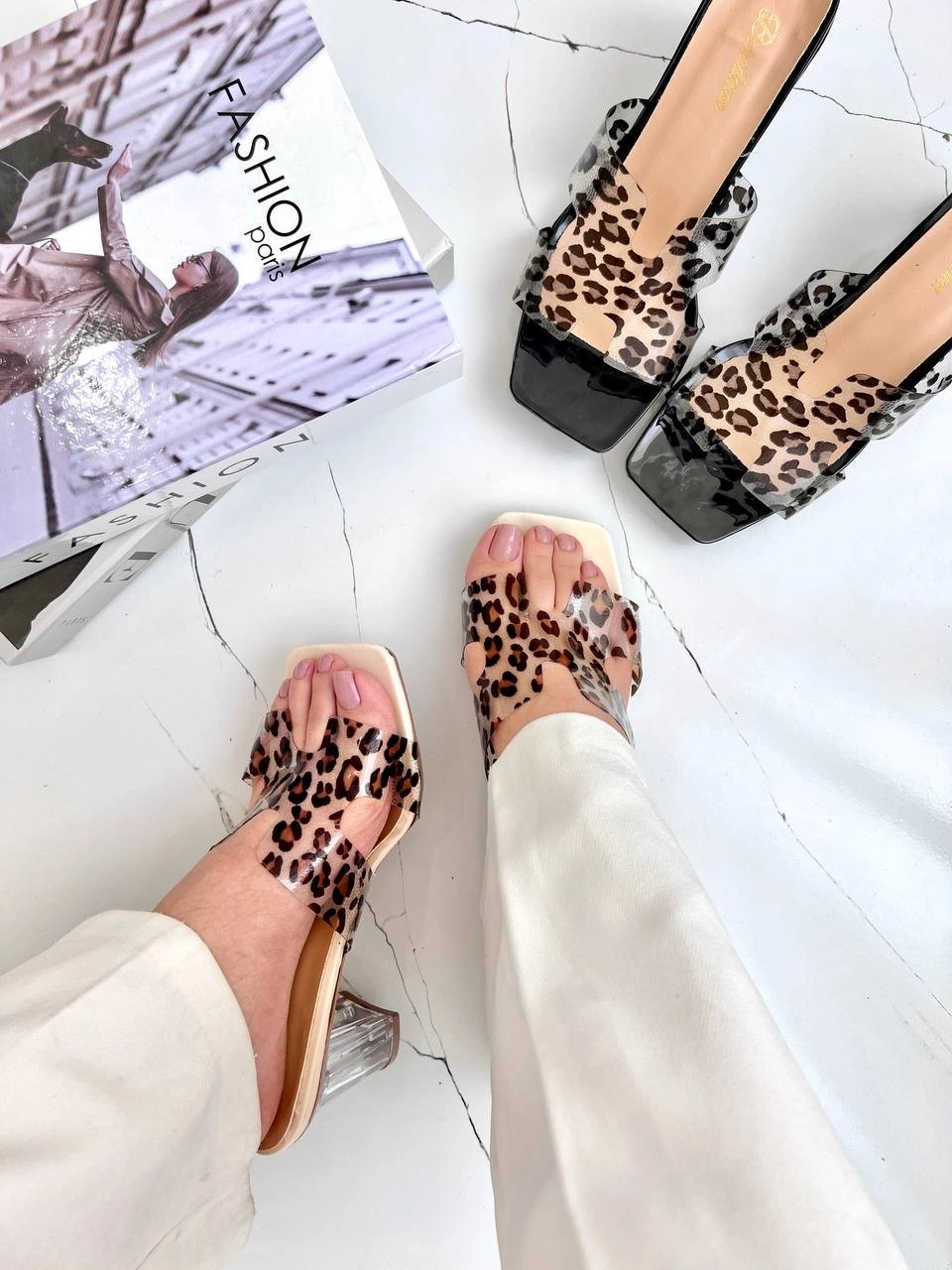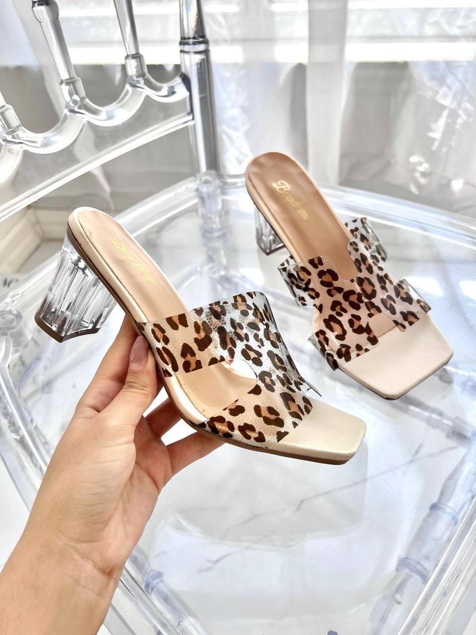 پاشنه ثابت 6 سانت شیشه ای طلق طرحدار پلنگی  قالب استاندارد